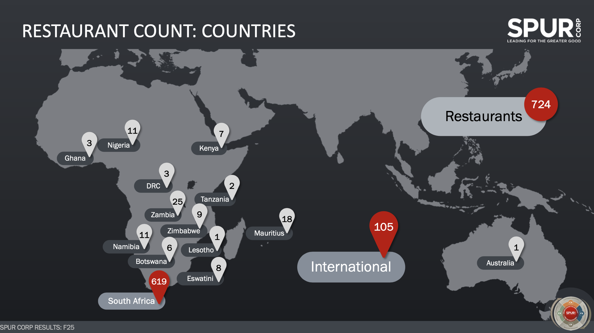 Internationally, the majority of franchised restaurants are Panarottis, Spur Steak Ranches, RocoMamas, John Dory’s and The Hussar Grill respectively.